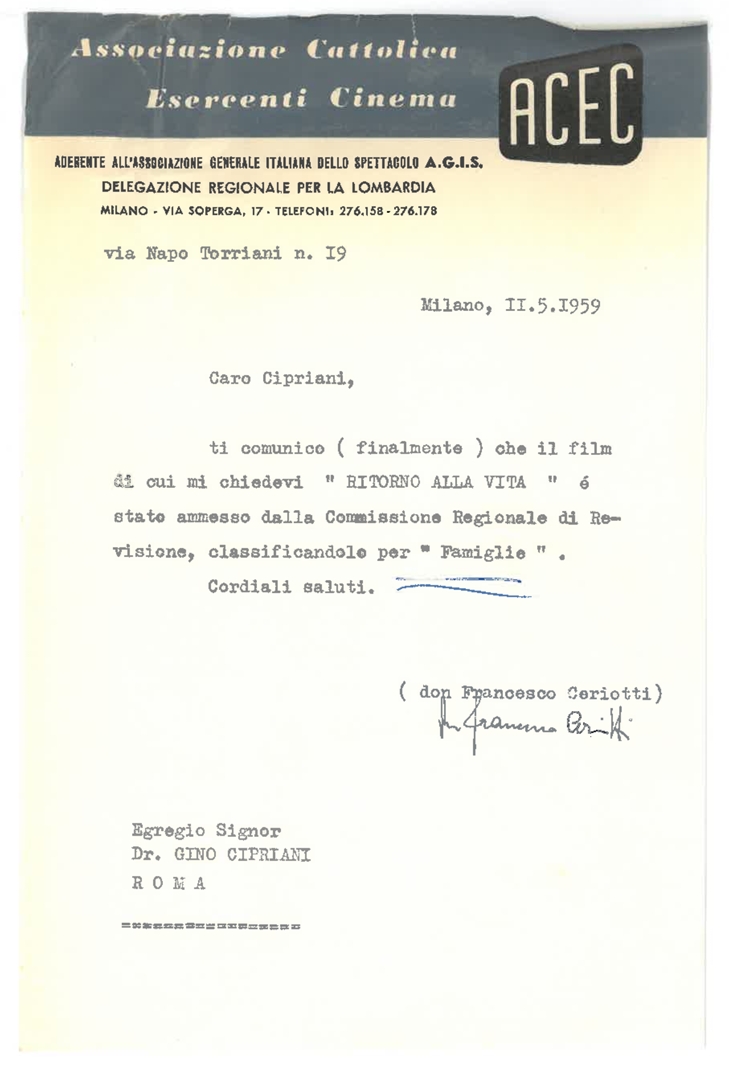 Don Francesco Ceriotti comunica a Gino Cipriani che il film "Ritorno alla vita" è stato ammesso dalla Commissione regionale di revisione che lo ha classificato "per famiglie". Dattiloscritto