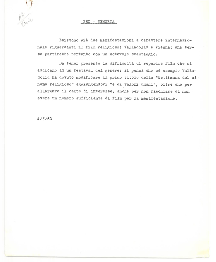 Nota sulle manifestazioni a carattere internazionale riguardanti il film religioso. Dattiloscritto