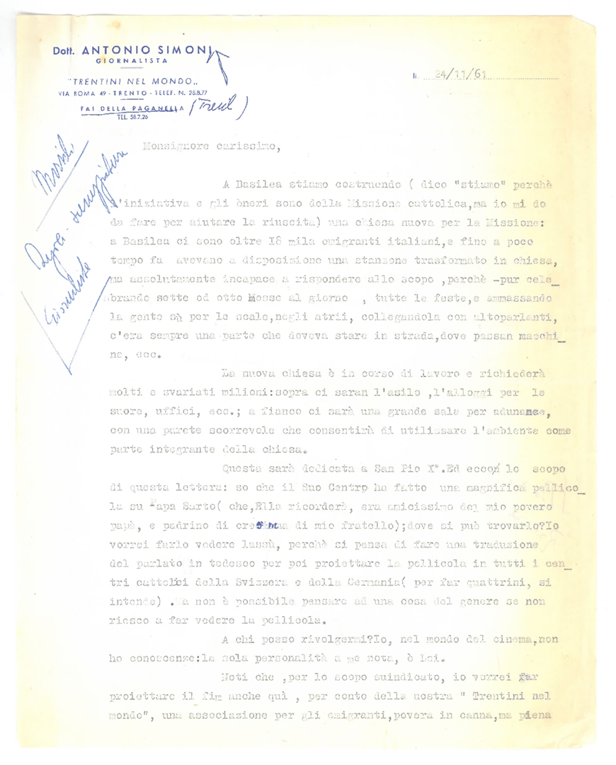 Lettera di Antonio Simoni, giornalista del periodico "Trentini nel mondo", a mons. Francesco Dalla Zuanna, presidente dell'ACEC