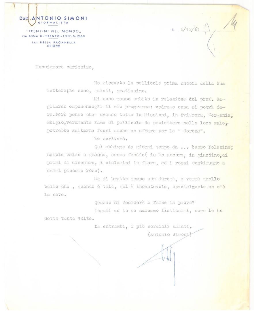 Antonio Simoni ringrazia mons. Francesco Dalla Zuanna per i cortometraggi ricevuti e fornisce aggiornamenti sul suo programma di distribuzione dei film presso le missioni all'estero. Dattiloscritto