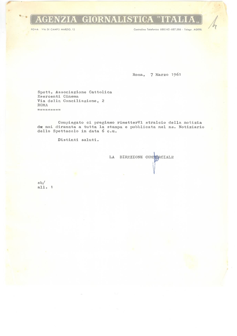 Stralcio della notizia diramata dall'Agenzia giornalistica Italia - AGI e pubblicata sul Notiziario dello spettacolo, n. 6 del marzo 1961