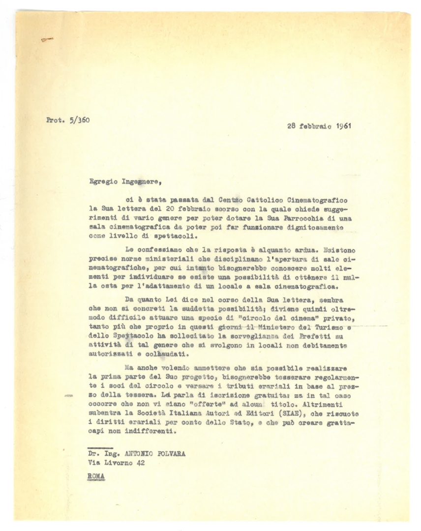 Silvano Battisti invia ad Antonio Polvara suggerimenti e norme per il progetto di istituire una sala cinematografica parrocchiale. Dattiloscritto