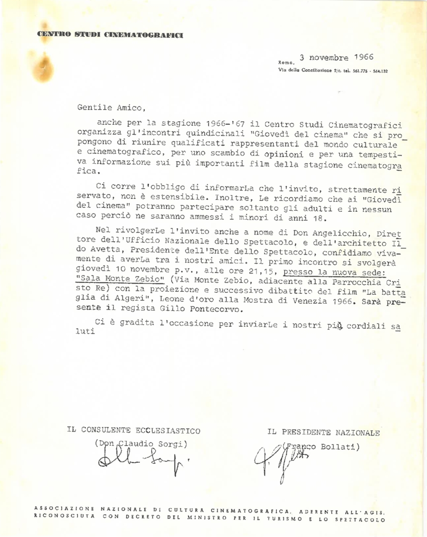 Lettera circolare a firma di don Claudio Sorgi, consulente ecclesiastico, e di Franco Bollati, presidente del Centro studi cinematografici - CSC