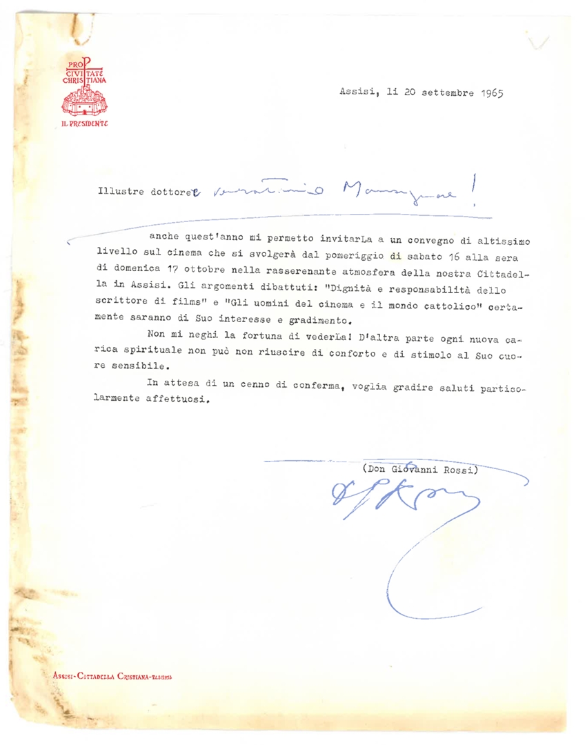 Don Giovanni Rossi invita mons. Francesco dalla Zuanna a partecipare ad un convegno sul cinema in programma per il 16-17 ottobre 1965 ad Assisi. Dattiloscritto
