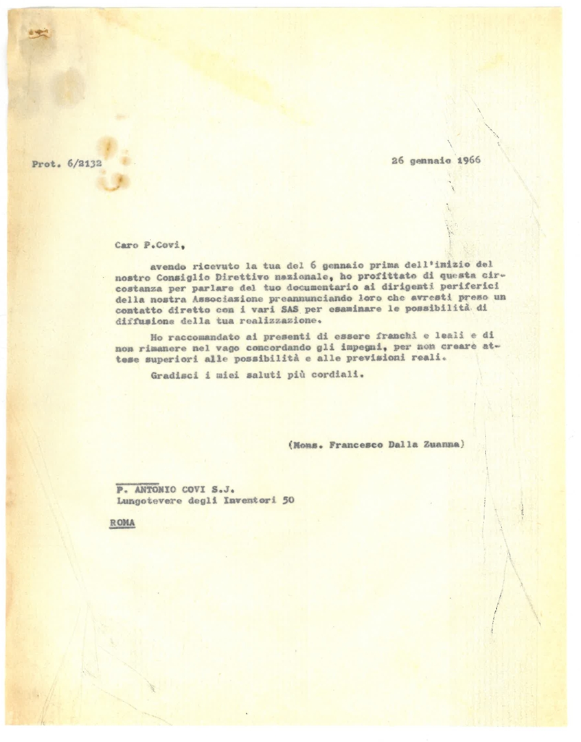 Lettera di mons. Francesco Dalla Zuanna, presidente dell'ACEC, a padre Antonio Covi, consulente ecclesiastico per la casa di produzione cinematografica cattolica Vita-Film