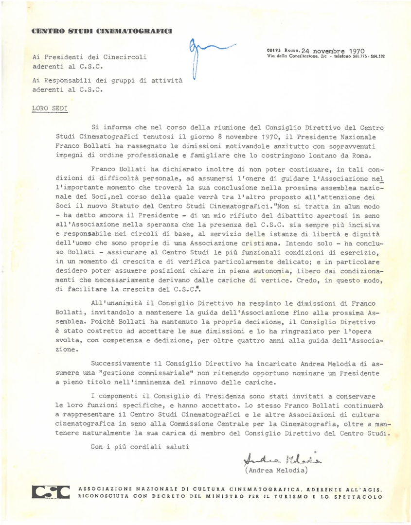 Andrea Melodia informa sulle dimissioni di Franco Bollati da presidente del CSC. Comunica inoltre di aver assunto l'incarico di una gestione commissariale dell'associazione. Dattiloscritto