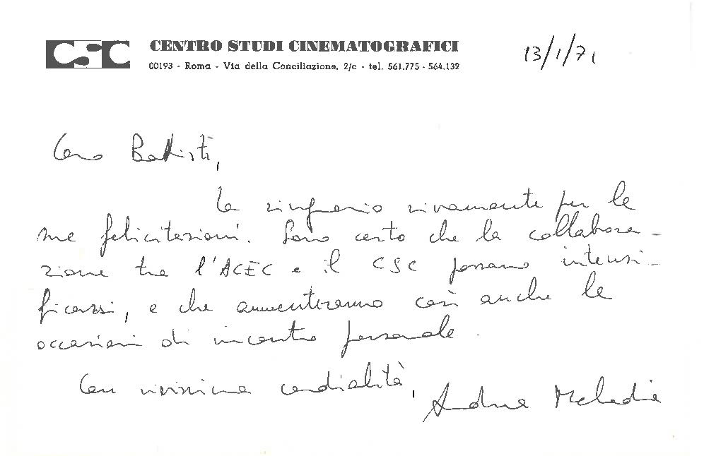 Lettera di Andrea Melodia, segretario generale del Centro studi cinematografici - CSC, a Silvano Battisti, segretario generale dell'ACEC
