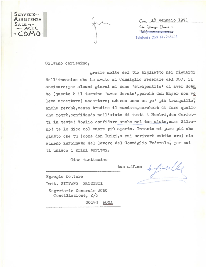 Con lettera di don Giuseppe Fossati, presidente del Consiglio federale del CSC, a Silvano Battisti, segretario generale dell'ACEC, in merito al nuovo incarico ricevuto. Dattiloscritto