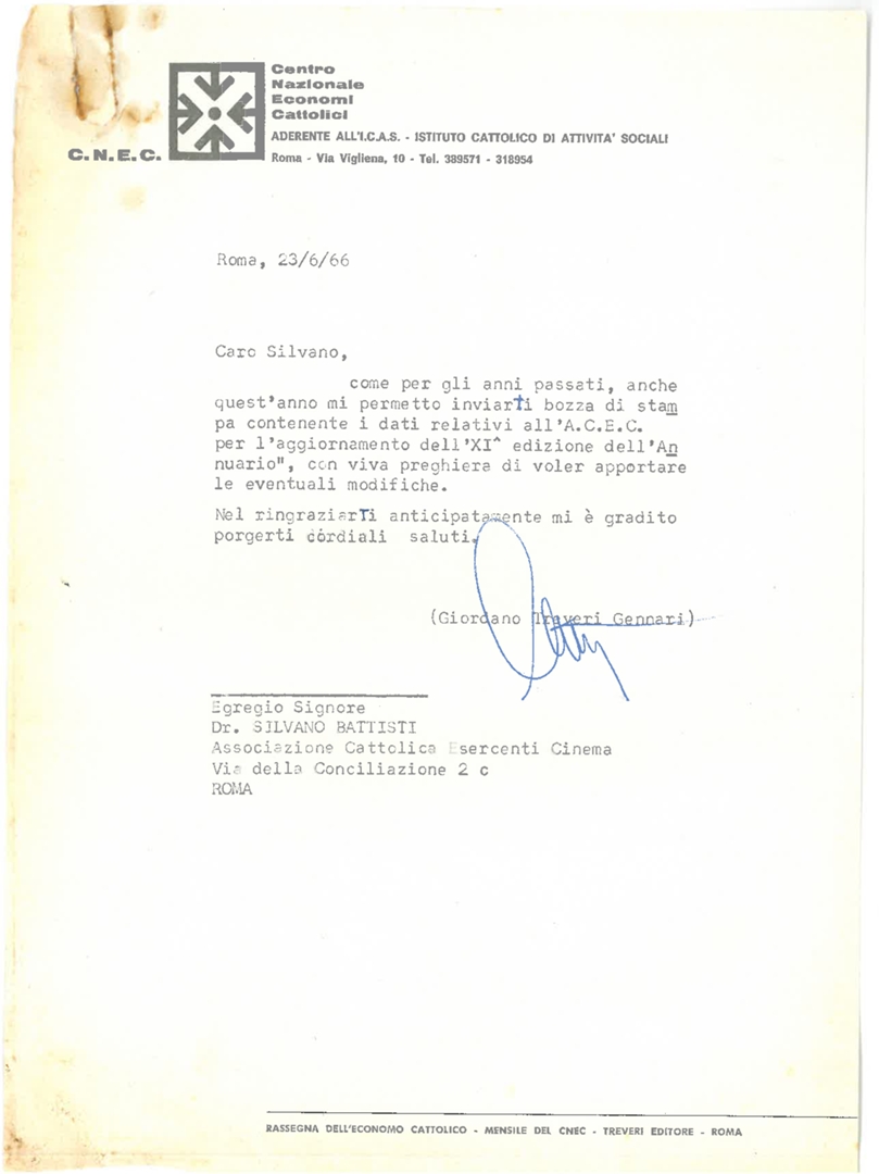 Lettera di Giordano Treveri Gennari, del Centro nazionale economi cattolici - CNEC, a Silvano Battisti, segretario generale dell'ACEC