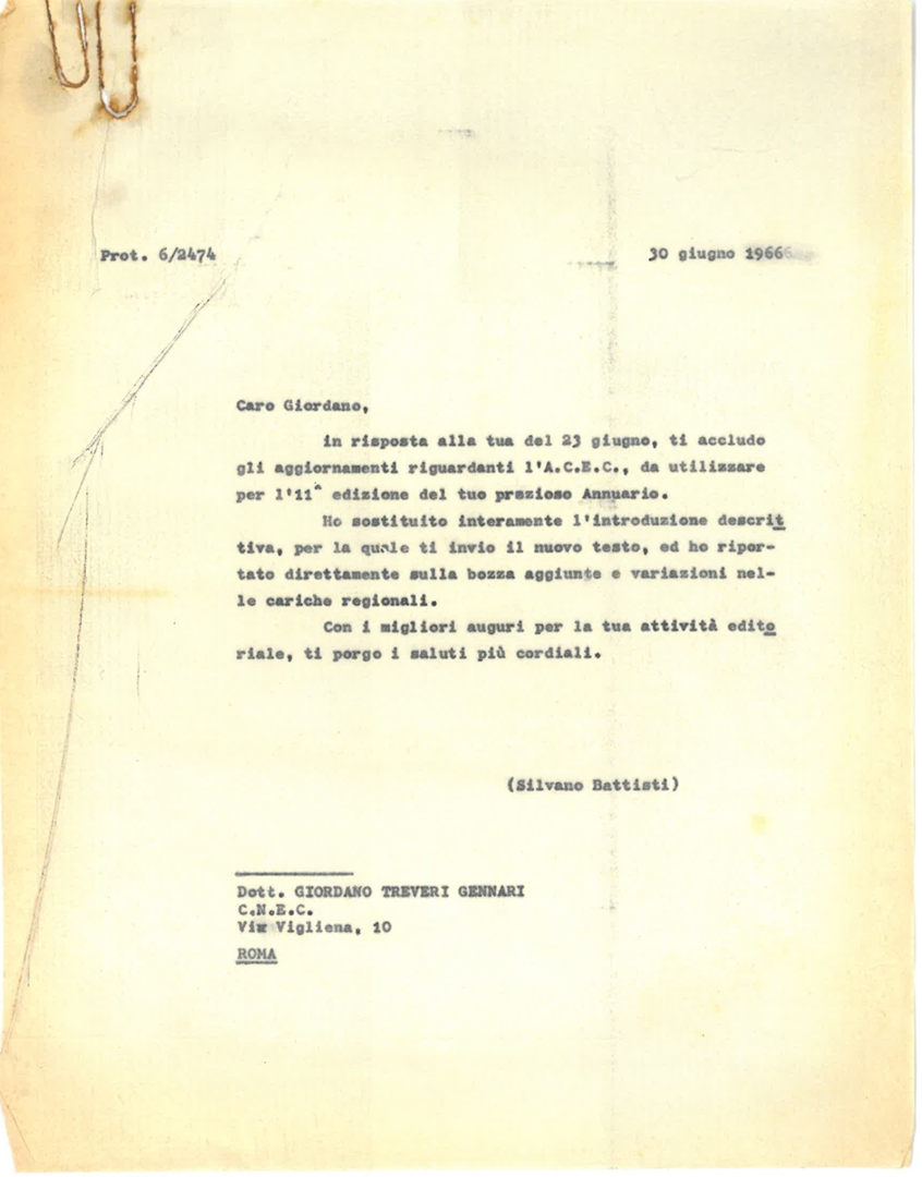 Silvano Battisti trasmette a Giordano Treveri Gennari gli aggiornamenti riguardanti l'ACEC per l'XI edizione dell'Annuario. Dattiloscritto
