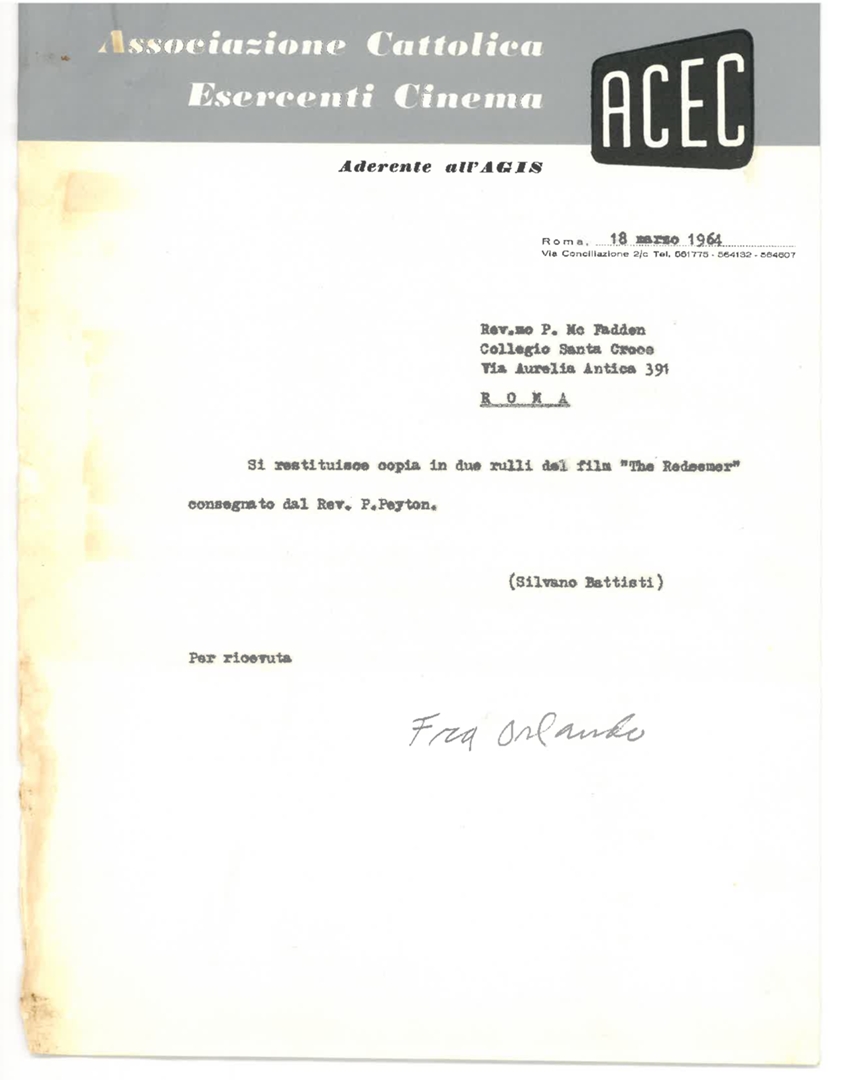 Silvano Battisti restituisce a padre Mc Fadden copia in due rulli del film "Il redentore - Redeemer". Dattiloscritto