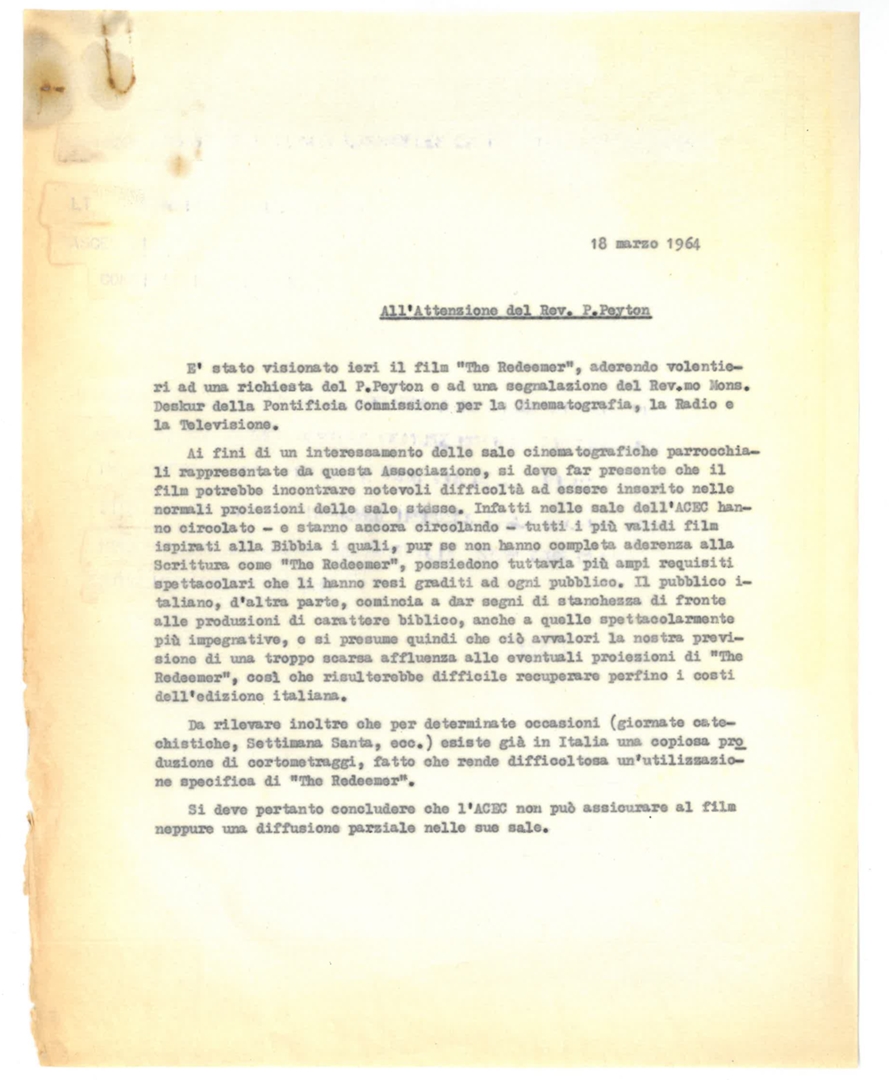 Silvano Battisti informa padre Patrick Peyton che l'ACEC non può assicurare la distribuzione nelle sale cinematografiche cattoliche del film "Il redentore - Redeemer". Dattiloscritto