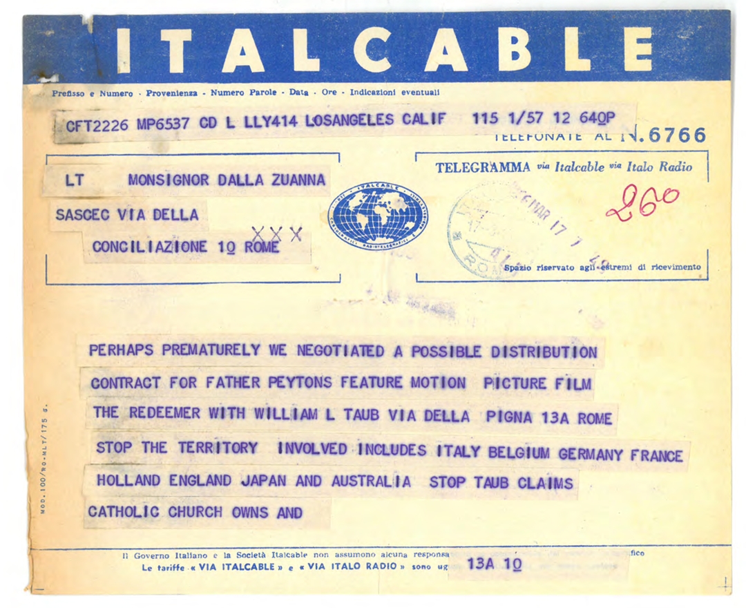 Telegramma di padre Albert J. Heinzer per mons. Francesco Dalla Zuanna, presidente dell'ACEC