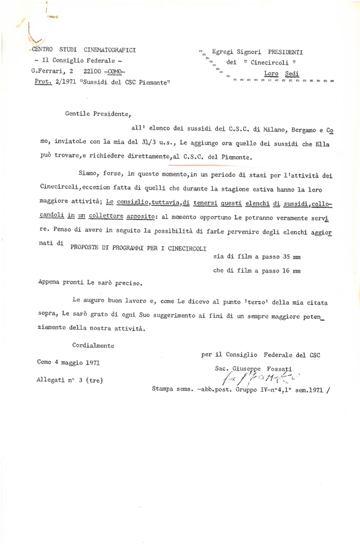 Con lettera di don Giuseppe Fossati, presidente del Consiglio federale del CSC, ai presidenti dei cinecircoli. Dattiloscritto