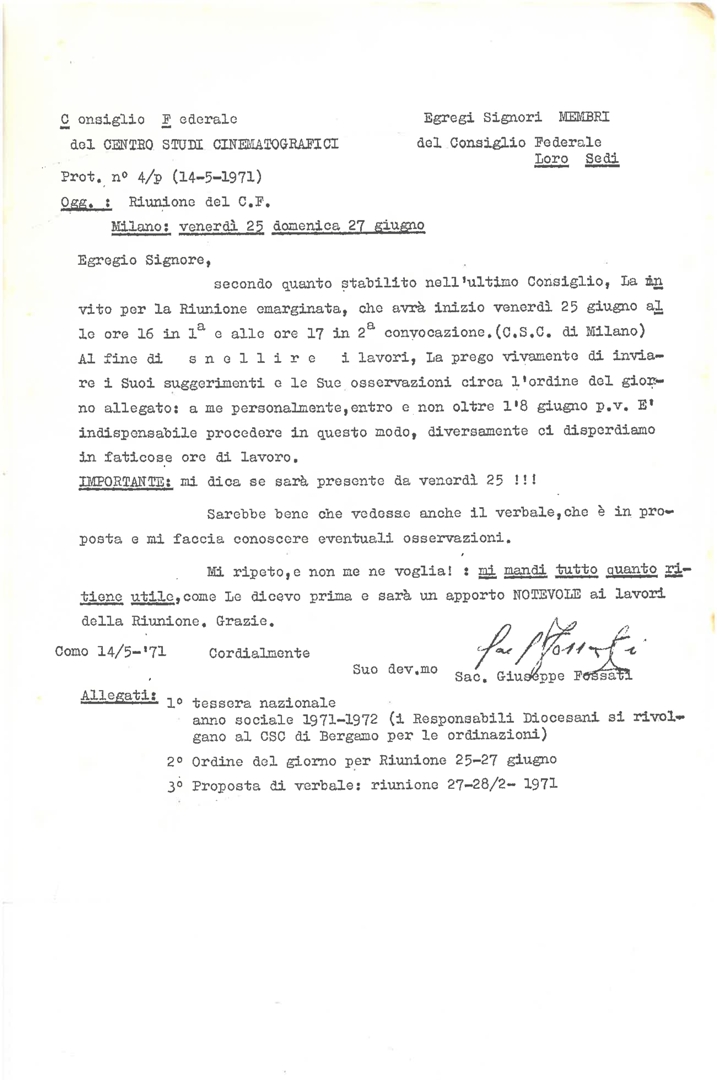 Con lettera di trasmissione di don Giuseppe Fossati, presidente del Consiglio federale del CSC, ai membri del Consiglio federale. Dattiloscritto