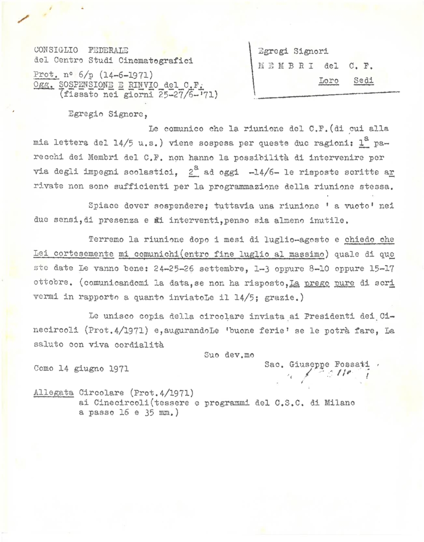 Consiglio federale del Centro sudi cinematografici - CSC. Sospensione e rinvio della riunione del 25-27 giugno 1971, proposte e programmi