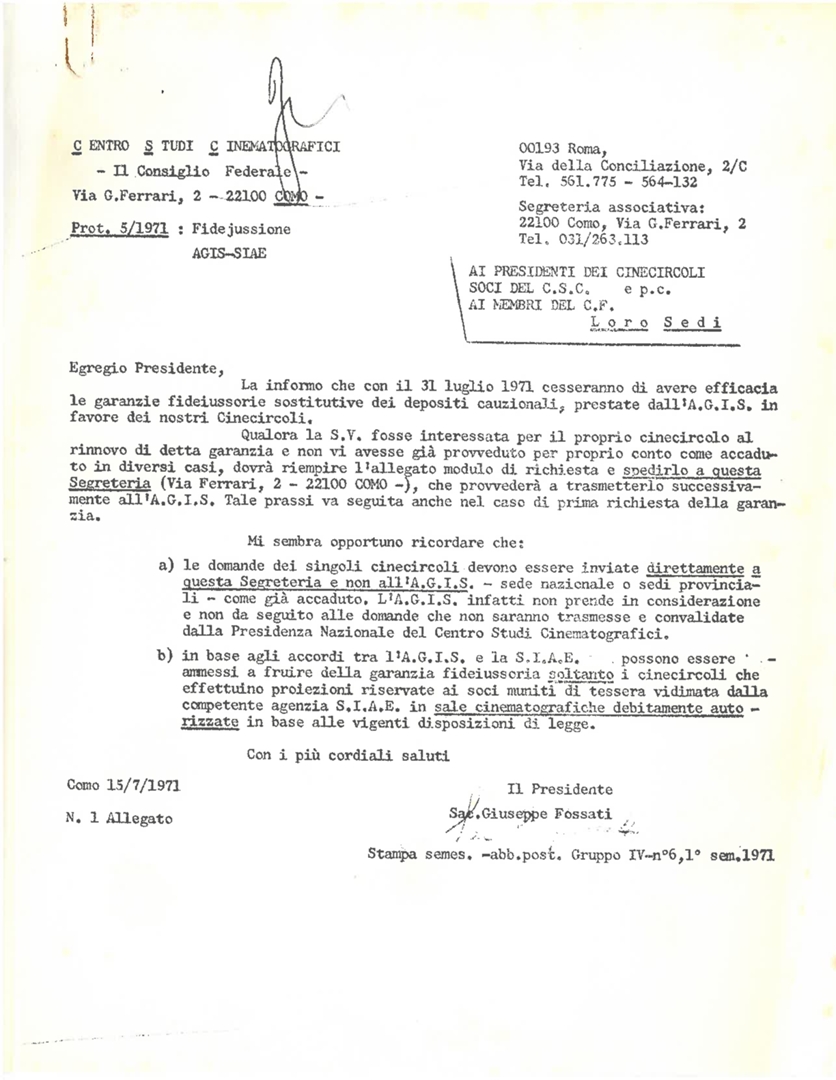 Con lettera di trasmissione di don Giuseppe Fossati, presidente del Consiglio federale del CSC ai presidenti dei cinecircoli. Dattiloscritto