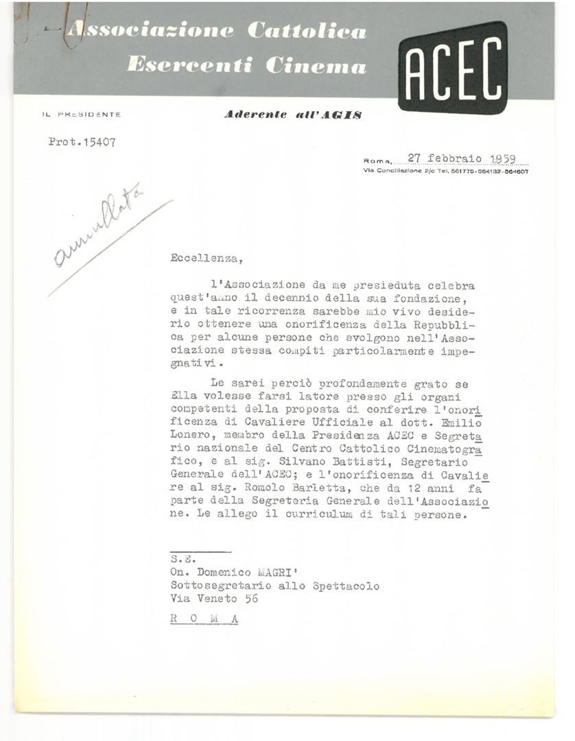 Mons. Francesco Dalla Zuanna chiede all'on. Domenico Magrì di poter ottenere l'onorificenza di cavaliere ufficiale per Emilio Lonero, membro della presidenza dell'ACEC e segretario nazionale del Centro cattolico cinematografico - CCC, per Silvano Battisti, segretario generale dell'ACEC, e per Romolo Barletta, membro della segreteria generale dell'ACEC. Allega i relativi curricula. Dattiloscritto
