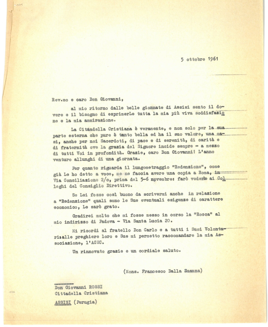 Mons. Francesco Dalla Zuanna scrive a don Giovanni Rossi in merito al film "La redenzione". Dattiloscritto