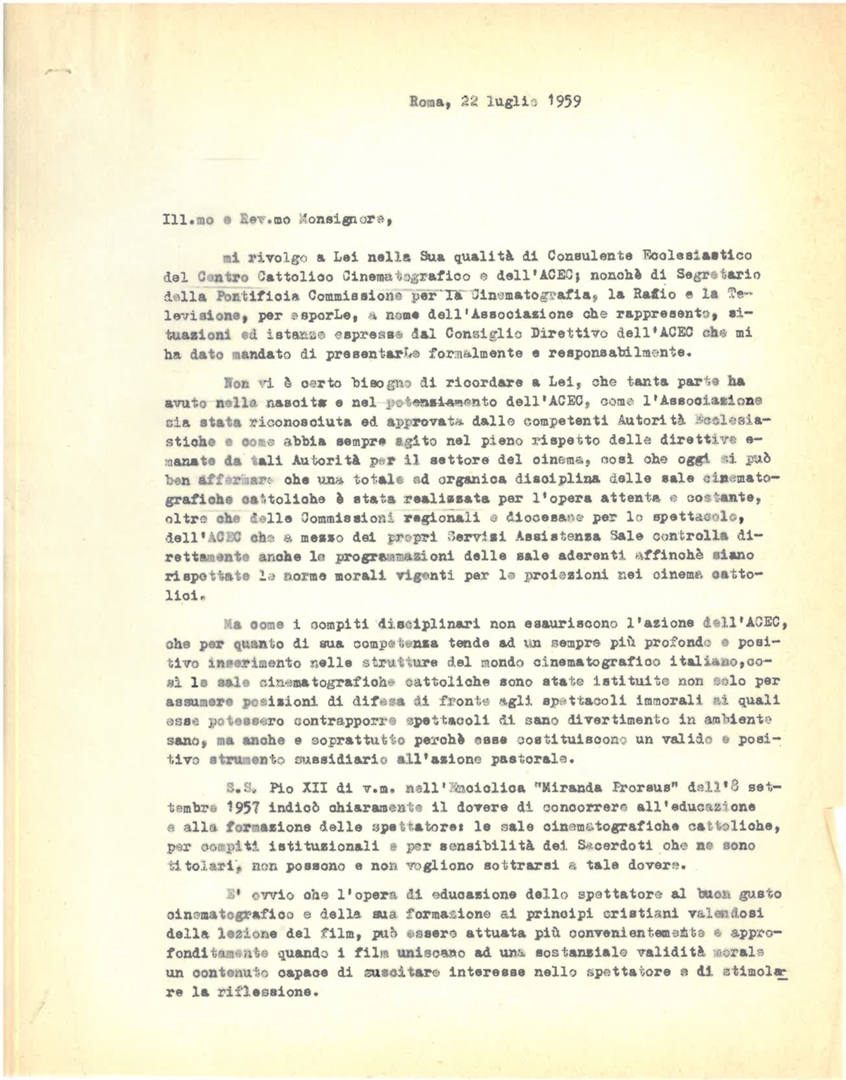 Lettera di mons. Francesco Dalla Zuanna, presidente dell'ACEC, a mons. Albino Galletto, consulente ecclesiastico del Centro cattolico cinematografico - CCC