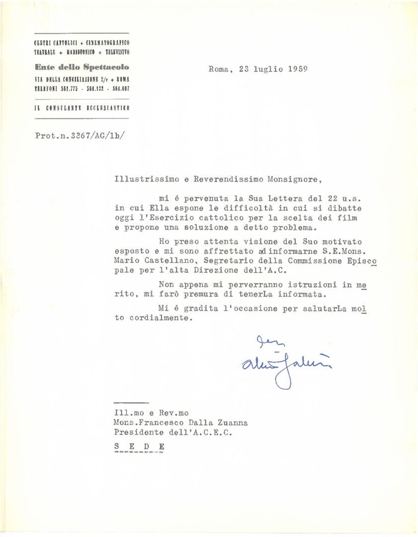 Lettera di mons. Albino Galletto, consulente ecclesiastico del Centro cattolico cinematografico - CCC, a mons. Francesco Dalla Zuanna, presidente dell'ACEC