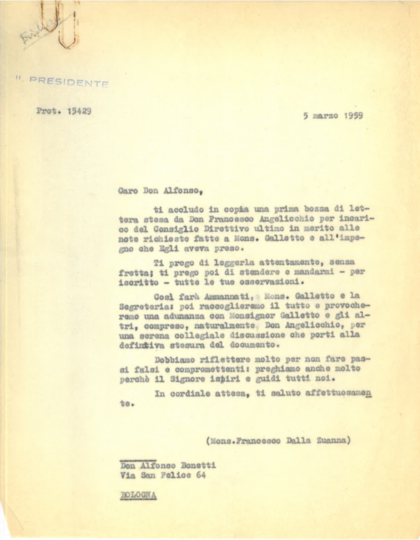 Lettera di mons. Francesco Dalla Zuanna, presidente dell'ACEC, a don Alfonso Bonetti