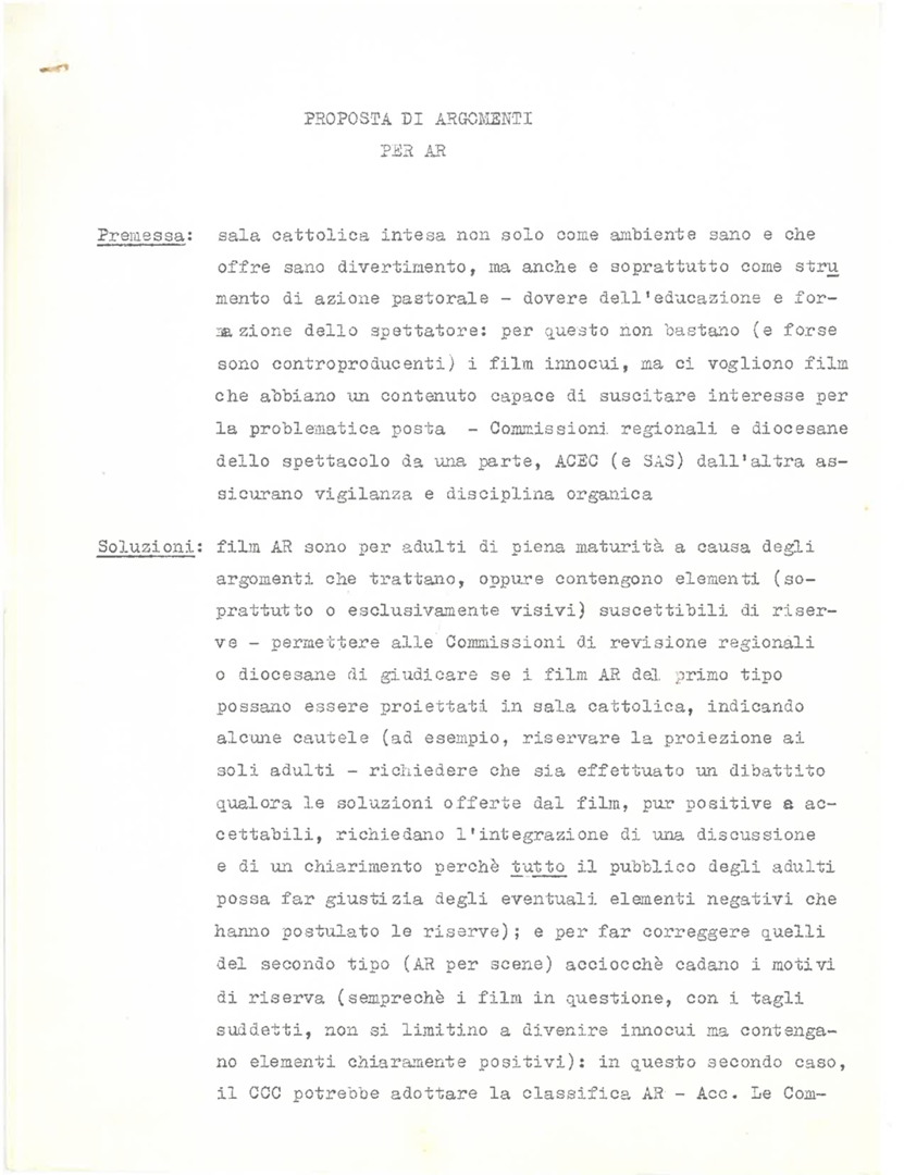 Osservazioni sul documento di don Francesco Angelicchio e in particolare sulla questione dell'ammissione dei film Adulti con Riserva (AR). Dattiloscritto