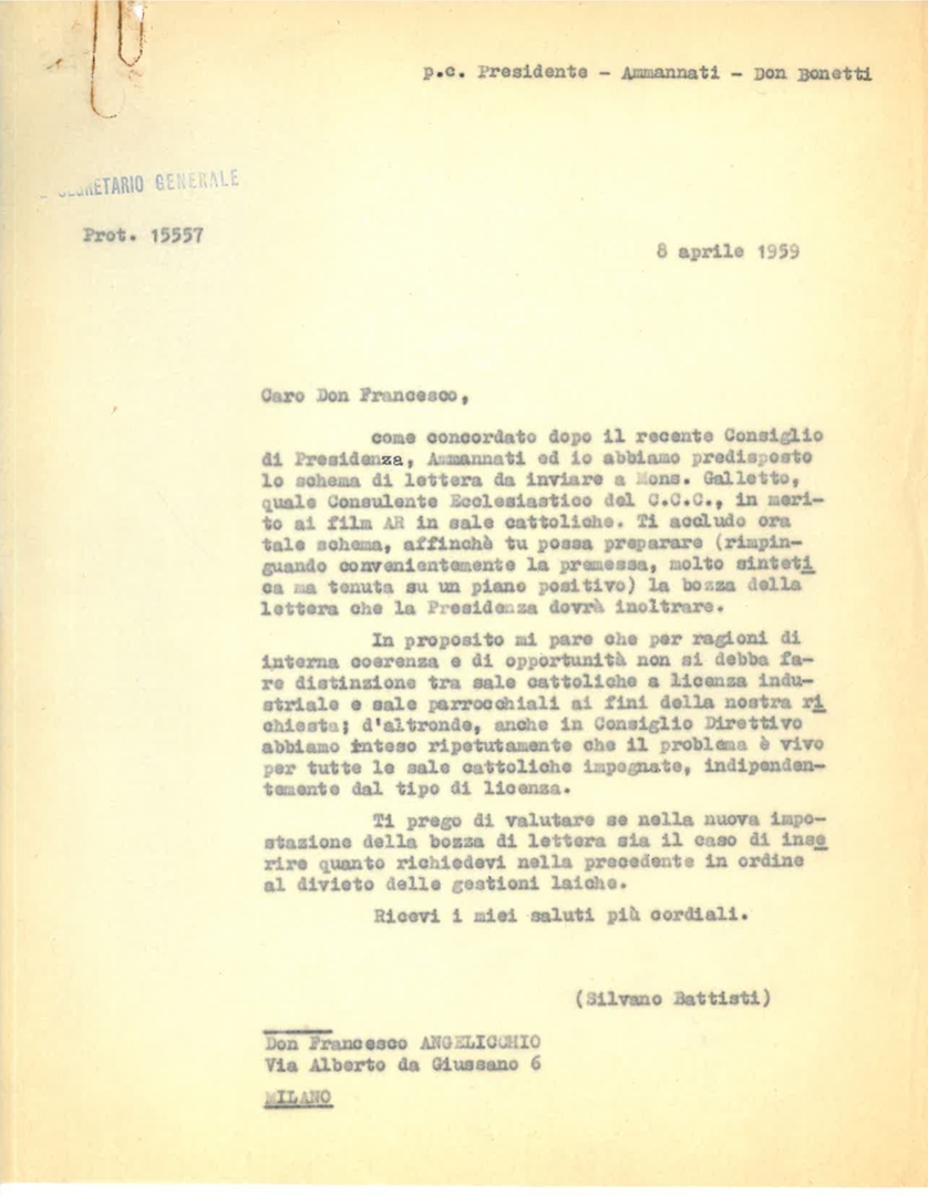 Lettera di Silvano Battisti, segretario generale dell'ACEC, a don Francesco Angelicchio, delegato della presidenza nazionale per l'Alta Italia