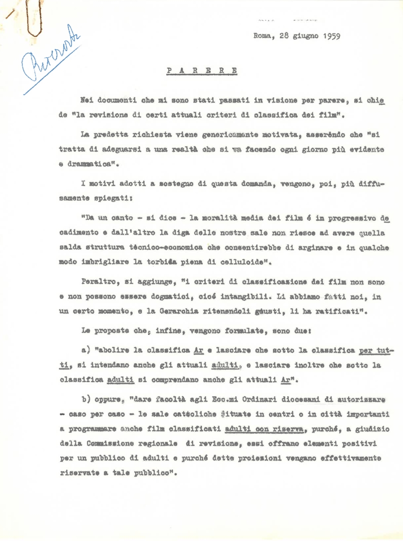 Parere di don Salvatore Canals, esperto della pastorale cinematografica e consulente della Pontificia Commissione per la Cinematografia, la Radio e la Televisione, sui film proiettabili nella sale cattoliche