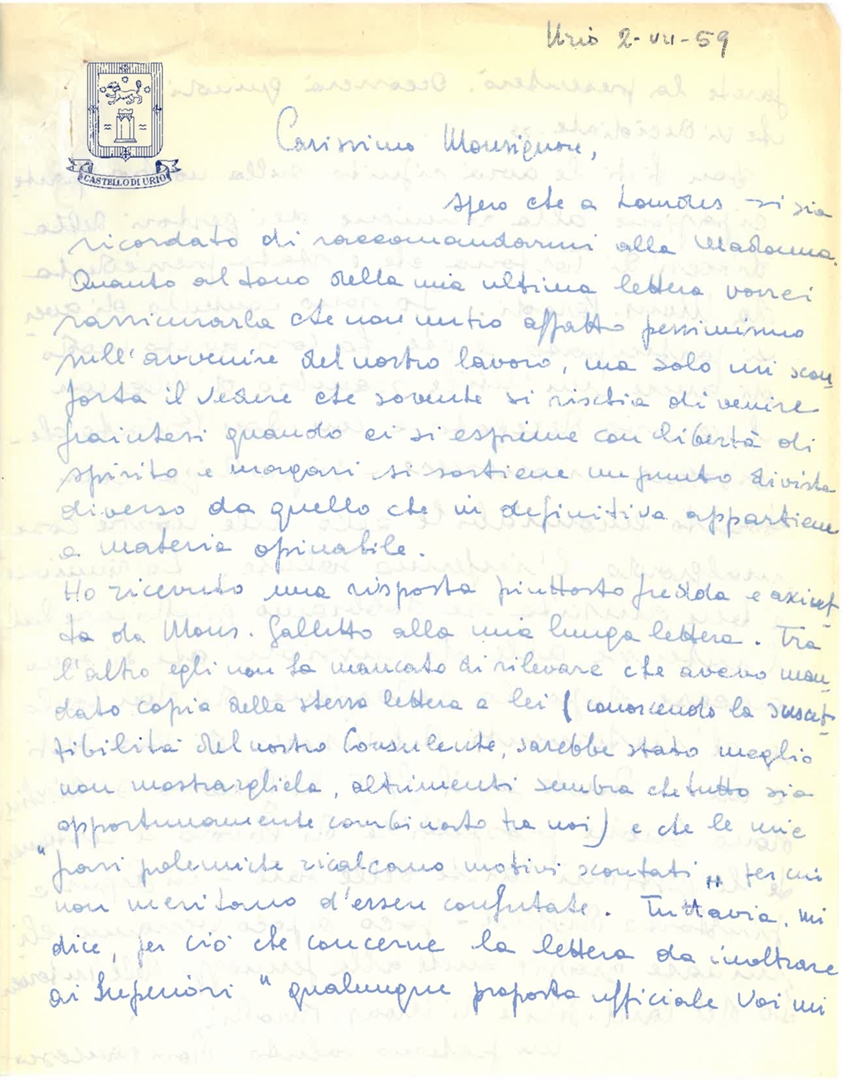 Lettera di don Francesco Angelicchio, delegato della presidenza nazionale per l'Alta Italia, a mons. Albino Galletto, consulente ecclesiastico del Centro cattolico cinematografico - CCC