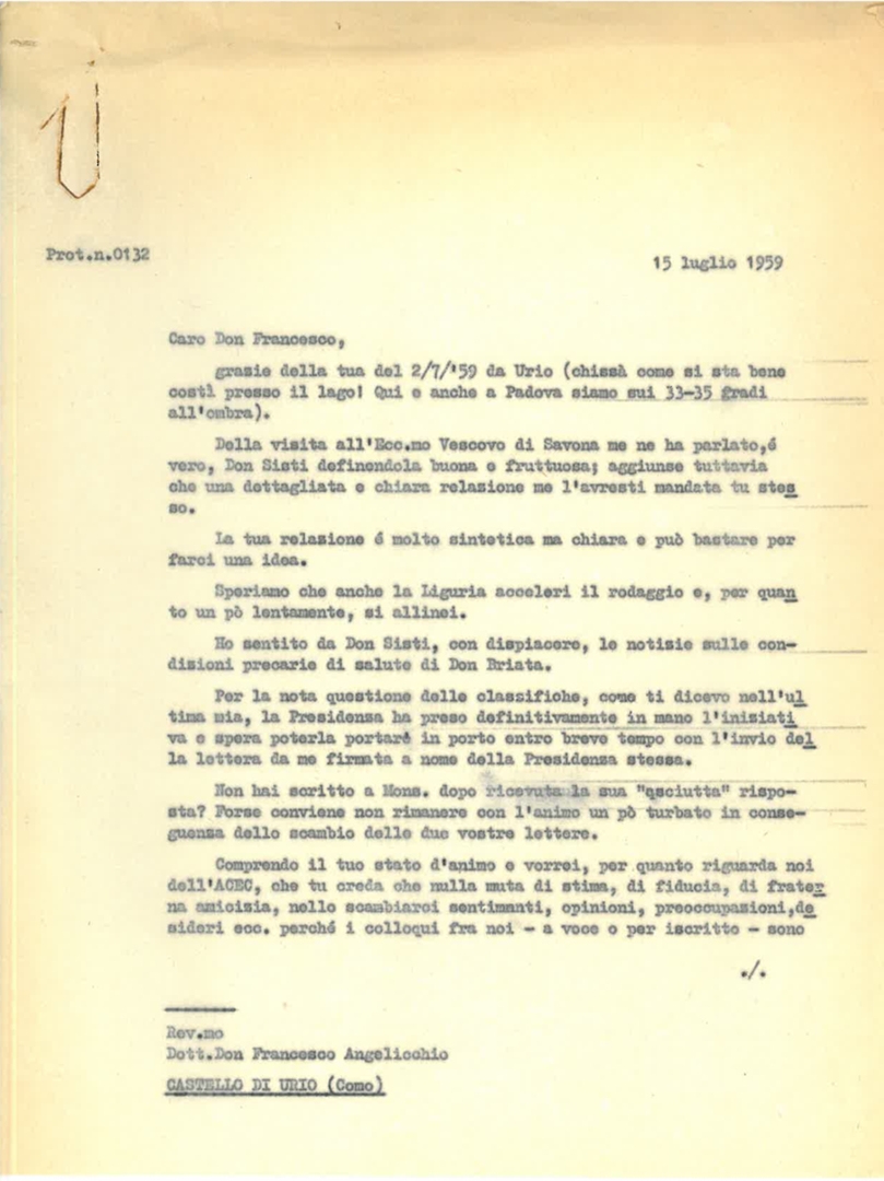 Lettera di don Francesco Angelicchio, delegato della presidenza nazionale per l'Alta Italia, a mons. Francesco Dalla Zuanna, presidente dell'ACEC