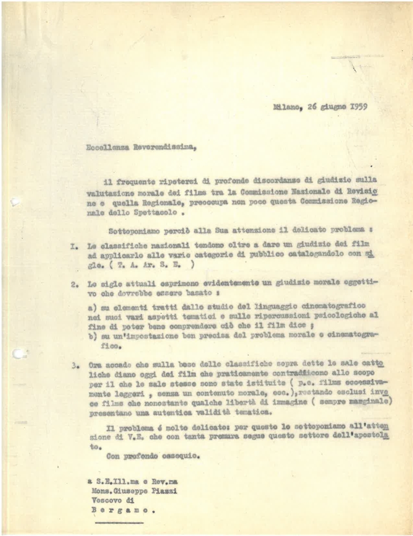 Don Francesco Ceriotti scrive a mons. Giuseppe Piazzi in merito alle discordanze di giudizio in atto sulla valutazione morale dei film. Dattiloscritto