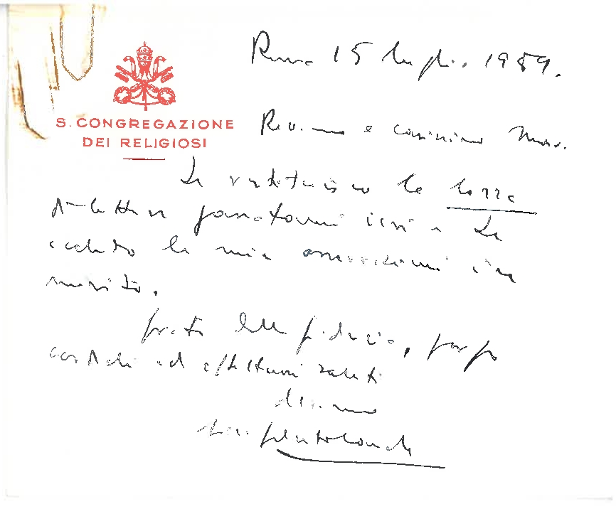 Lettera di don Salvatore Canals, esperto della pastorale cinematografica e consulente della Pontificia Commissione per la Cinematografia, la Radio e la Televisione, a mons. Francesco Dalla Zuanna, presidente dell'ACEC