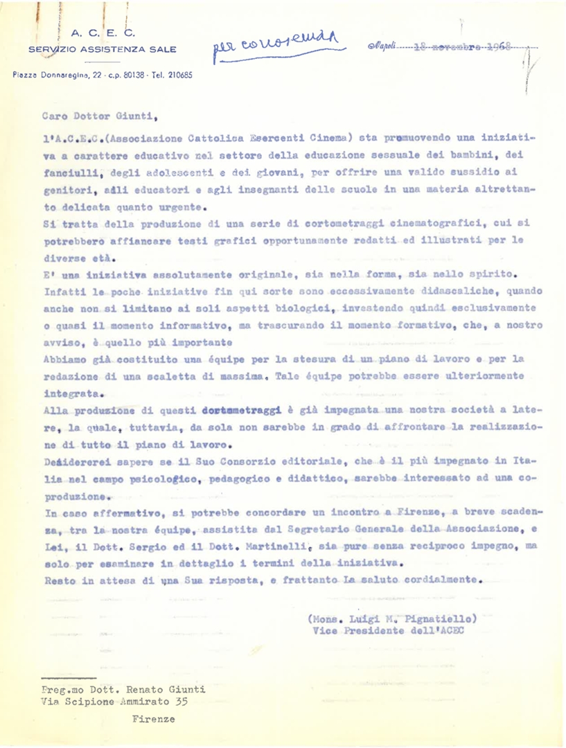 Lettera di Mons. Luigi Pignatiello, vicepresidente dell'ACEC al prof. Renato Giunti