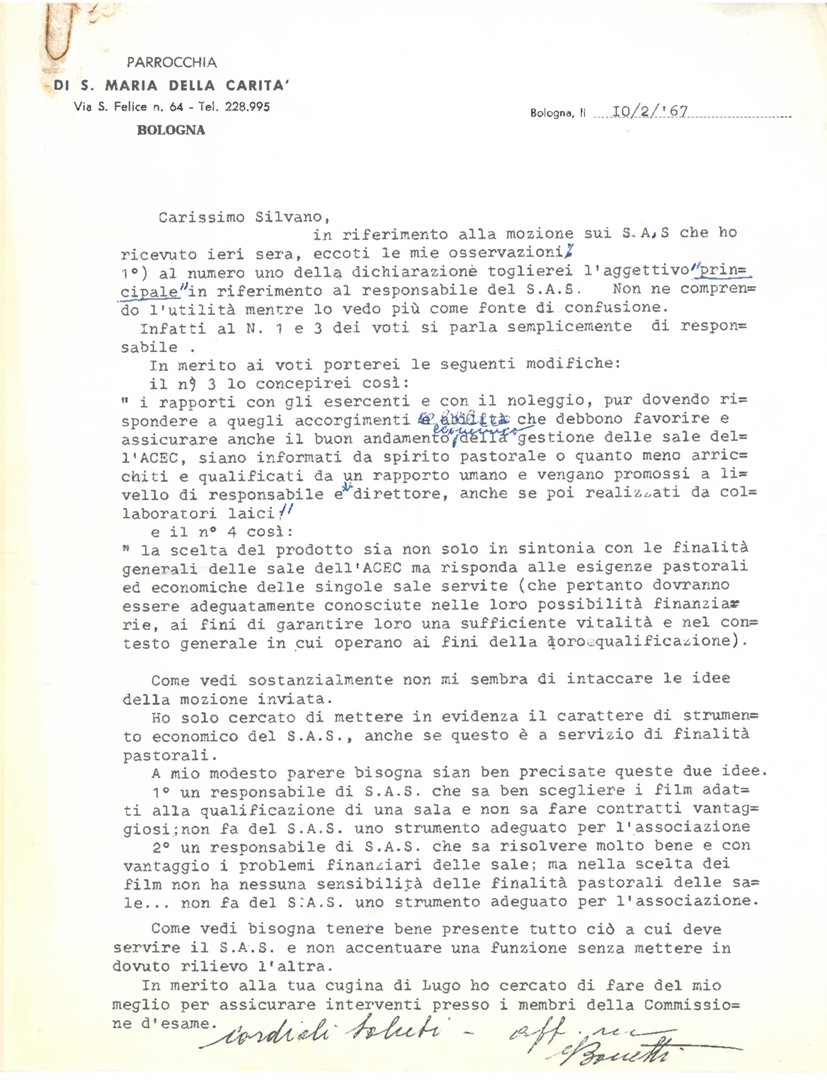 Lettera di don Alfonso Bonetti, parroco della parrocchia di Santa Maria della Carità di Bologna, a Silvano Battisti, segretario generale dell'ACEC