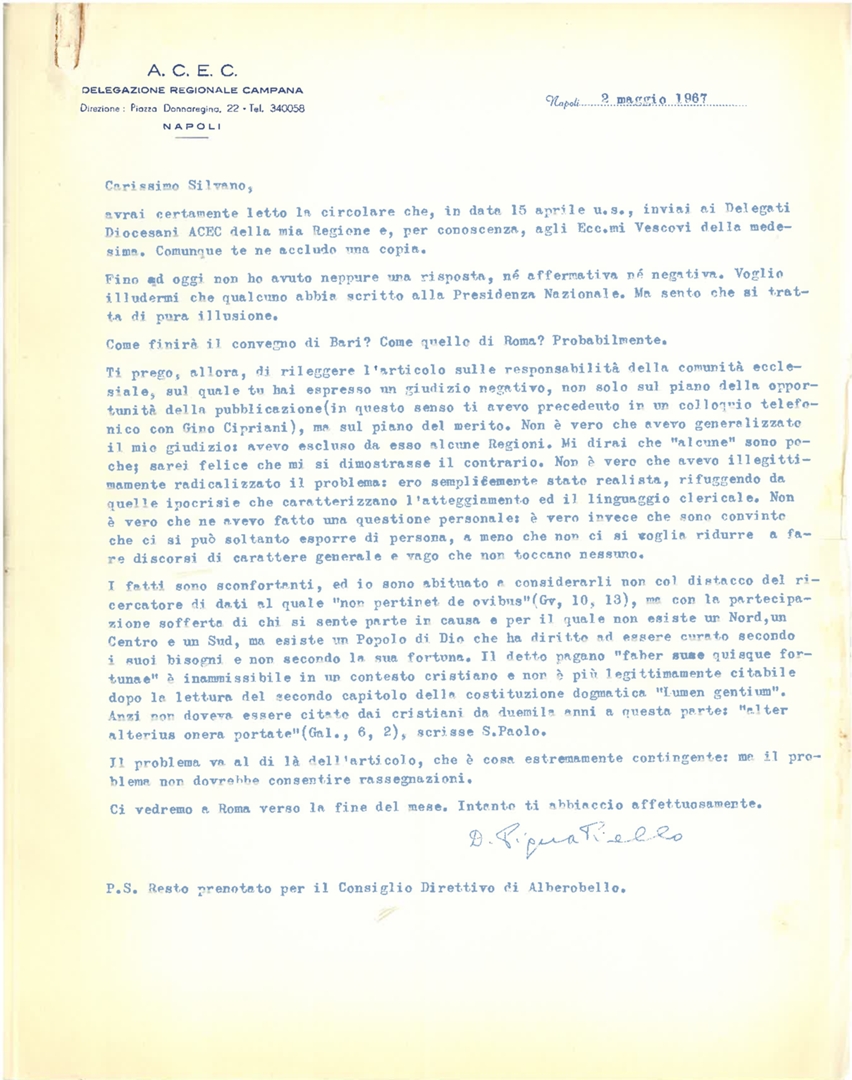 Lettera di Silvano Battisti, segretario generale dell'ACEC, a mons. Luigi Pignatiello, delegato regionale per la Campania