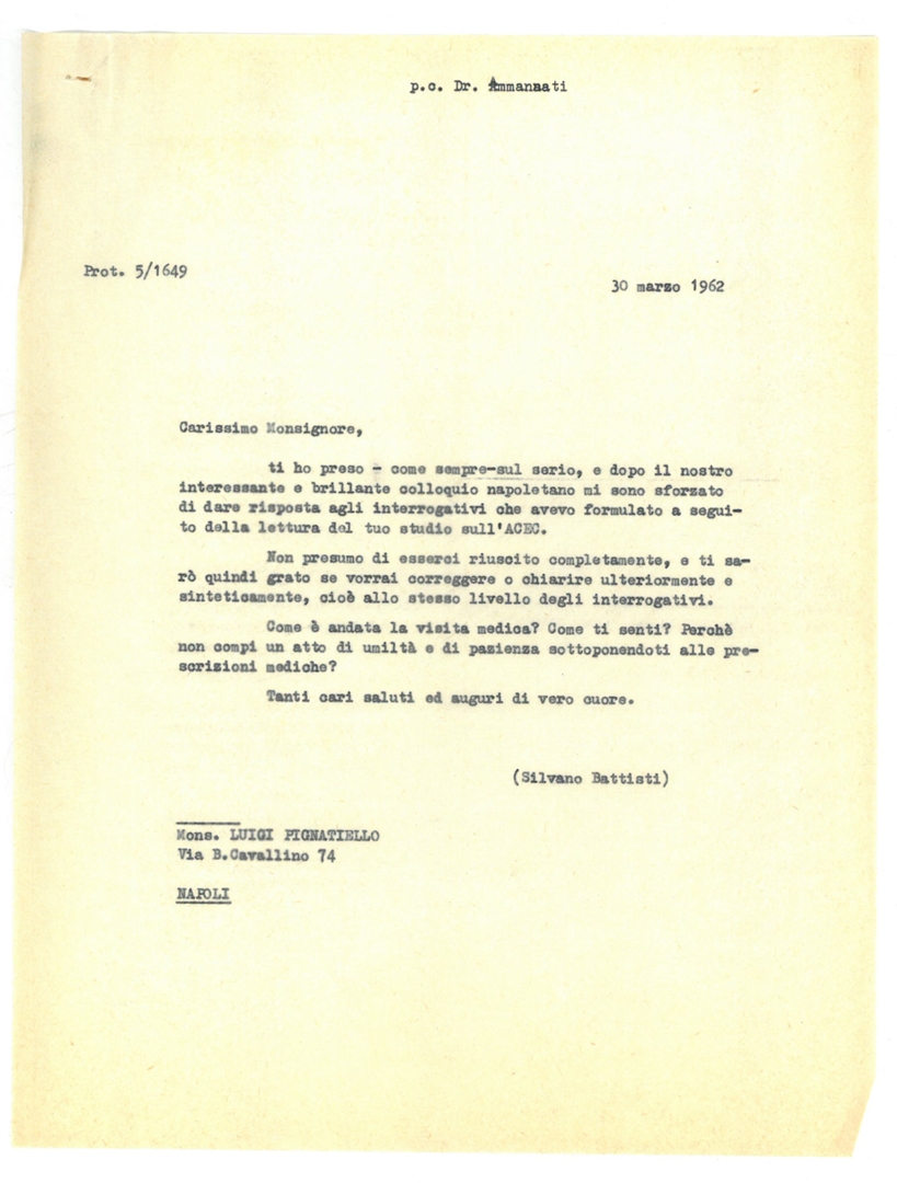 Silvano Battisti, segretario generale dell'ACEC, invia a mons. Luigi Pignatiello le sue osservazioni sul documento. Dattiloscritto