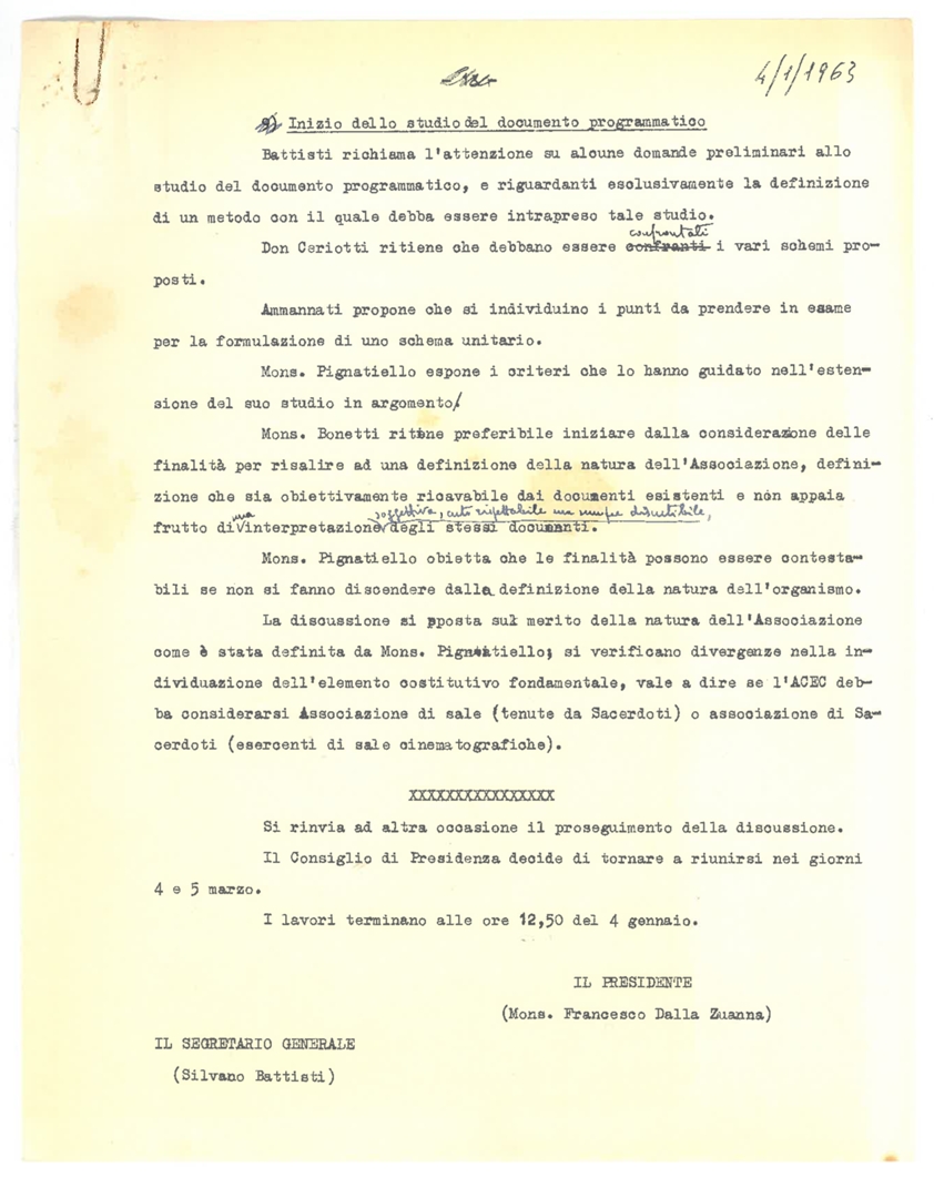 Mons. Francesco Dalla Zuanna e Silvano Battisti inviano le domande preliminari allo studio del documento programmatico, con le osservazioni di don Ceriotti, Floris Luigi Ammannati, mons. Pignatiello, mons. Bonetti. Dattiloscritto e manoscritto