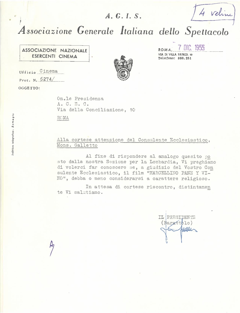 Lettera di Vincenzo Barattolo, presidente dell'Associazione generale italiana dello spettacolo - AGIS, a mons. Albino Galletto, consulente ecclesiastico dell'Ente dello spettacolo presso la Presidenza dell'ACEC