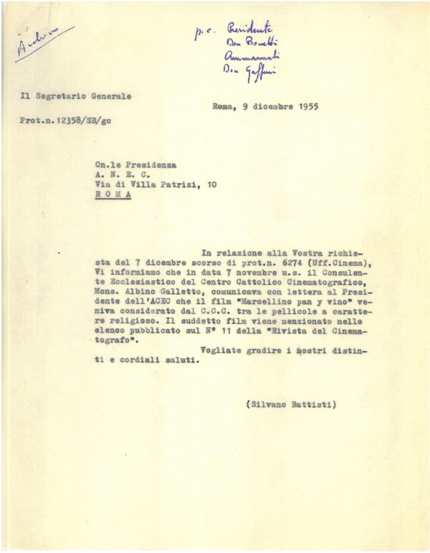 Silvano Battisti comunica alla presidenza dell'ANEC che il film "Marcelino pan y vino" è da considerarsi a carattere religioso. Dattiloscritto