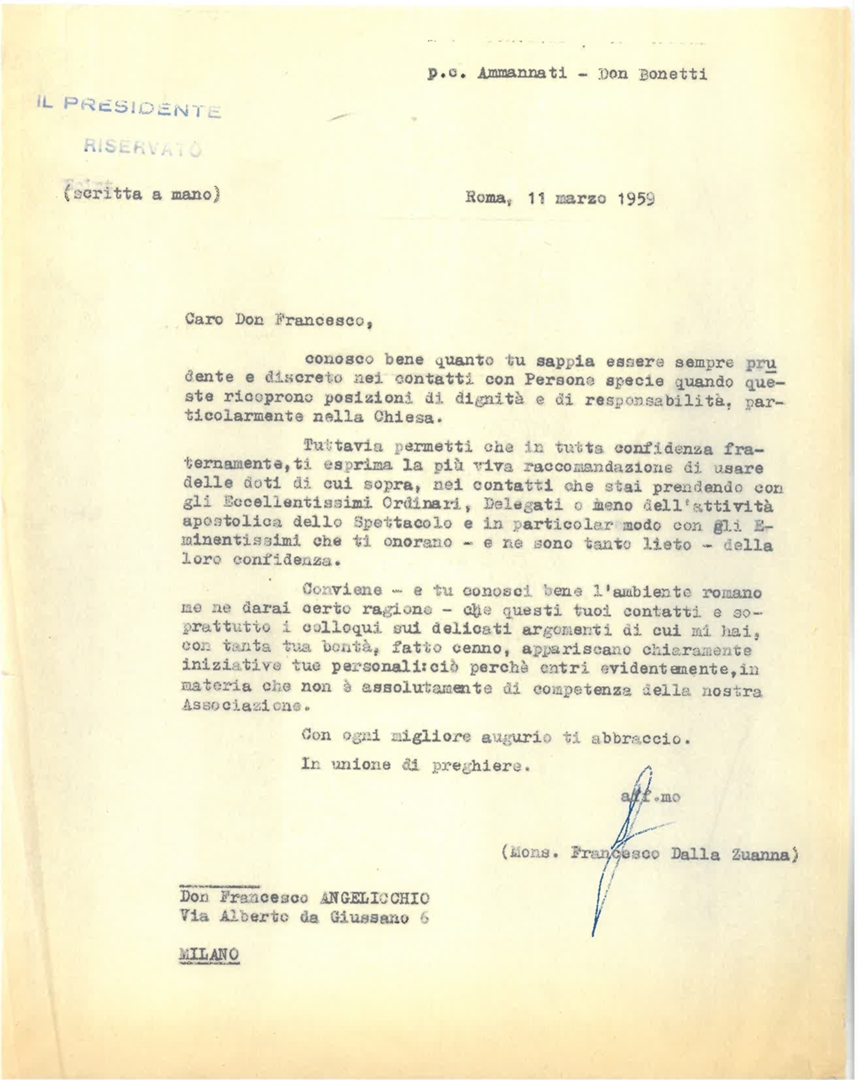 Mons. Francesco Dalla Zuanna raccomanda a don Francesco Angelicchio l'atteggiamento più opportuno per i contatti con le personalità della Chiesa. Dattiloscritto