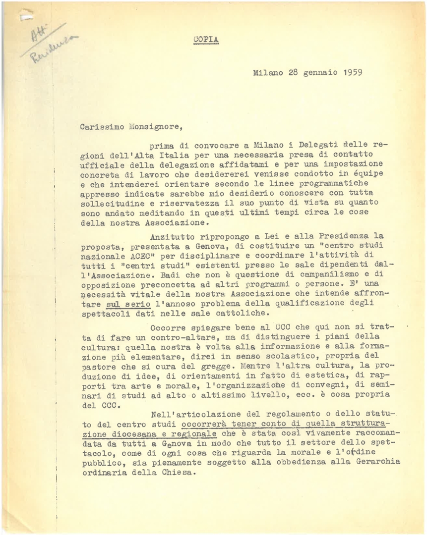Lettera di don Francesco Angelicchio, delegato della presidenza nazionale per l'Alta Italia, a mons. Francesco Dalla Zuanna, presidente dell'ACEC