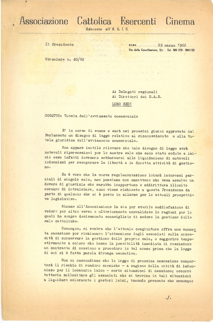 Mons. Francesco Dalla Zuanna scrive ai delegati regionali e ai direttori dei SAS a proposito del nuovo disegno di legge sul riconoscimento e la tutela giuridica dell'avviamento commerciale. Dattiloscritto