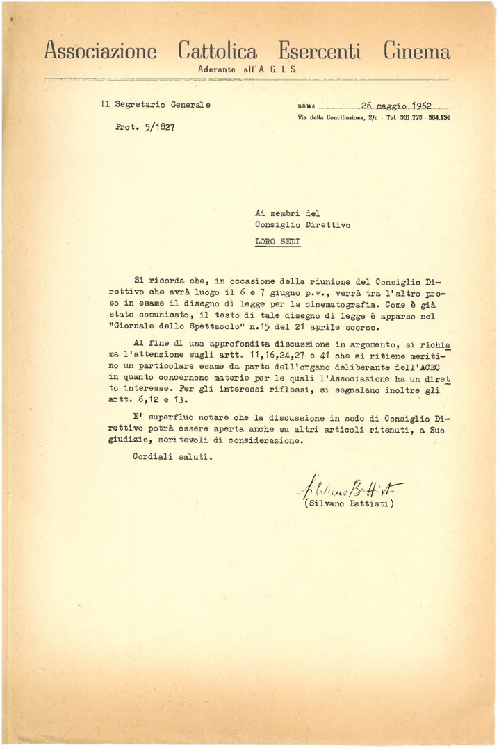 Silvano Battisti scrive ai membri del Consiglio direttivo a proposito del disegno di legge sulla cinematografia che sarà oggetto di esame nella prossima riunione del Consiglio. Dattiloscritto