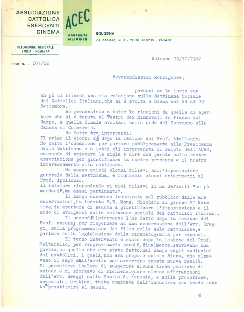Don Alfonso Bonetti scrive a mons. Francesco Dalla Zuanna a proposito della Settimana sociale dei cattolici italiani svoltasi a Siena dal 24 al 29 settembre 1962. Dattiloscritto