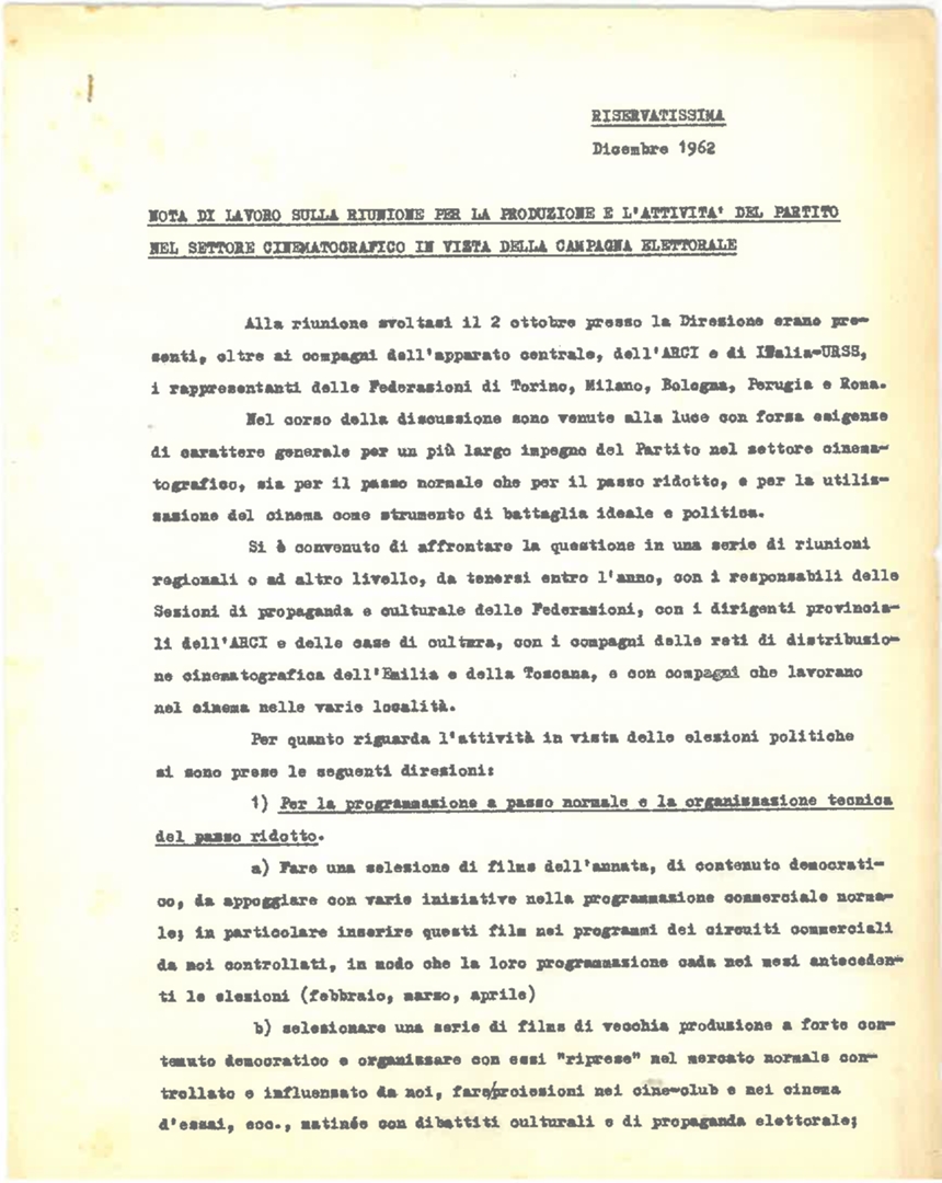 "Nota di lavoro sulla riunione per la produzione e l'attività del Partito nel settore cinematografico in vista della campagna elettorale"