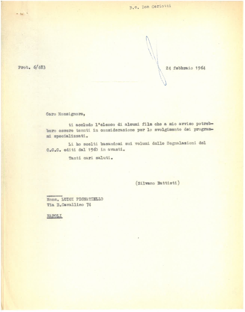 Con lettera di trasmissione di Silvano Battisti, segretario generale dell'ACEC, a mons. Luigi Pignatiello, delegato regionale per la Campania. Dattiloscritto e manoscritto