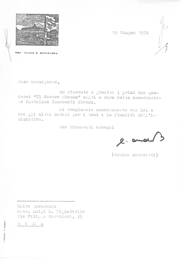 Lettera dell'on. Giulio Andreotti a mons. Luigi Pignatiello, presidente dell'ACEC