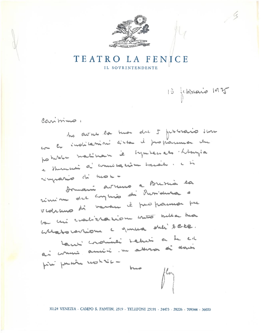 Lettera di Floris Luigi Ammannati, sovrintendente del Teatro La Fenice di Venezia e consulente tecnico dell'ACEC, a mons. Luigi Pignatiello, presidente dell'ACEC