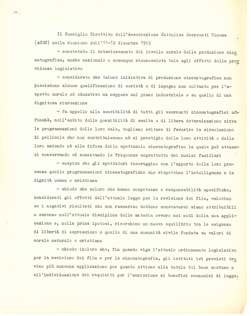 Richieste del Consiglio direttivo dell'ACEC a seguito della riunione dell'11-12 dicembre 1963. Dattiloscritto